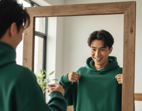 ブランドパーカーのロゴのツヤ、フードの立ち上がり、その細部のこだわりが、